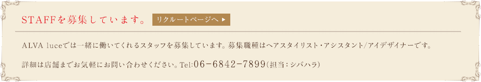 【TEL】ヘアサロン専用 06-6842-7899/ネイル・アイラッシュ専用 06-6398-9512